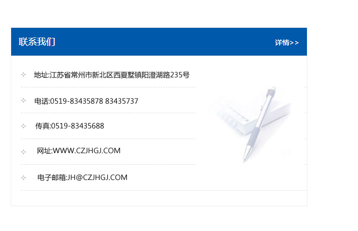 地址:常州市新北區友邦商務大廈1幢16、17層  電話:0519-85101652  傳真:0519-85112595  郵編:213022  網址:www_cz-jiayue_cn.shgxtech.com  郵箱:xiajifengaa@163.com